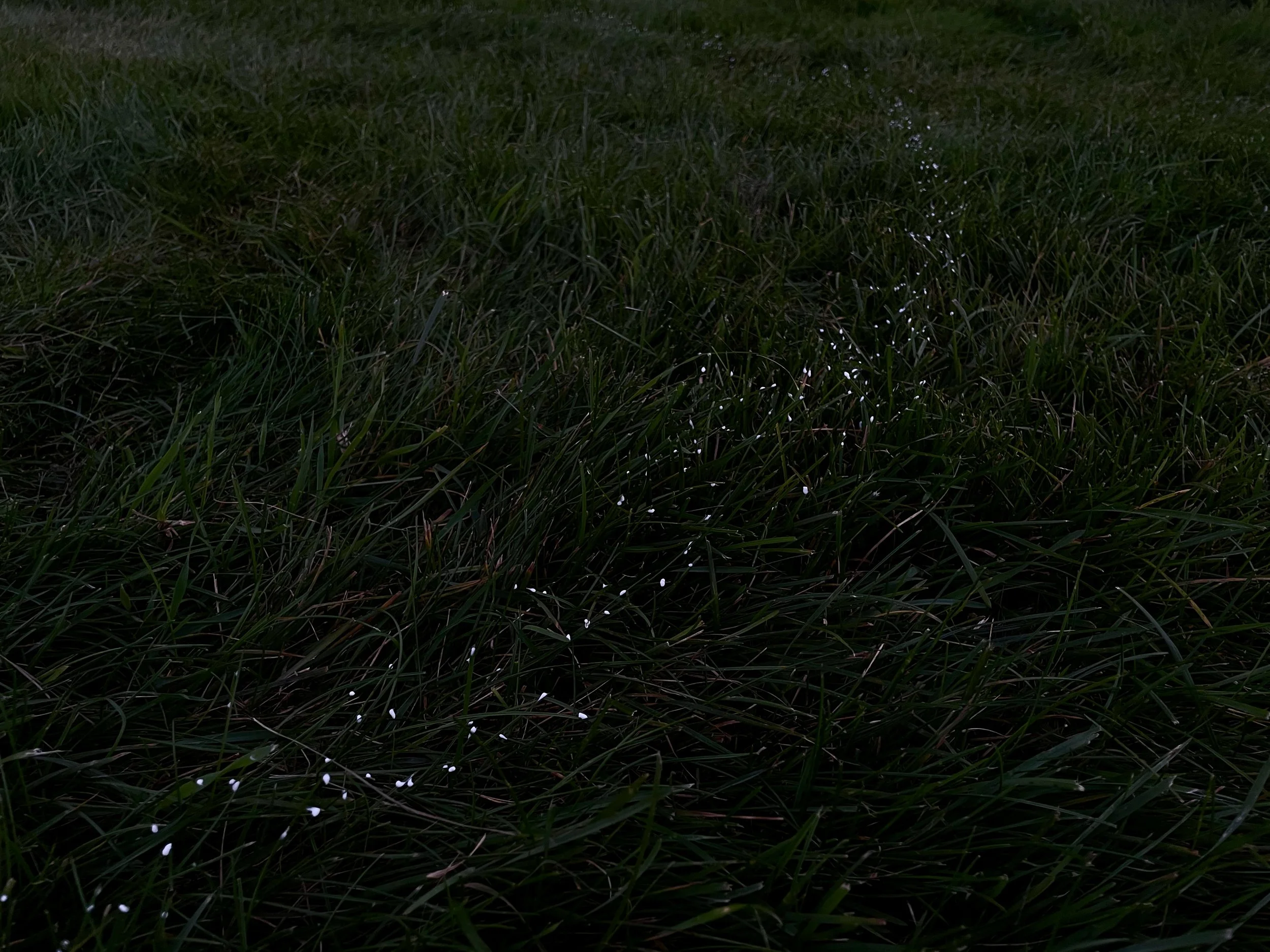 UV resin droplets, placed delicately yet inevitably precariously on a large field of grass, become sturdier as they receive ultraviolet rays from the sun, instead of vaporizing like actual dew. At least, I expected so.
