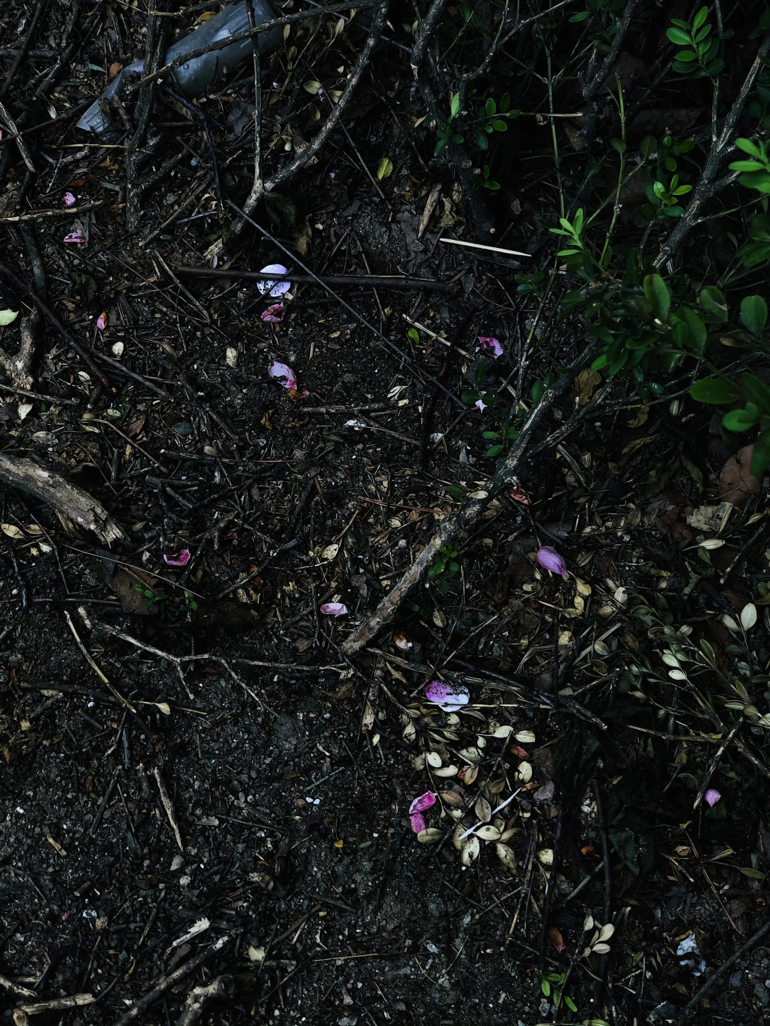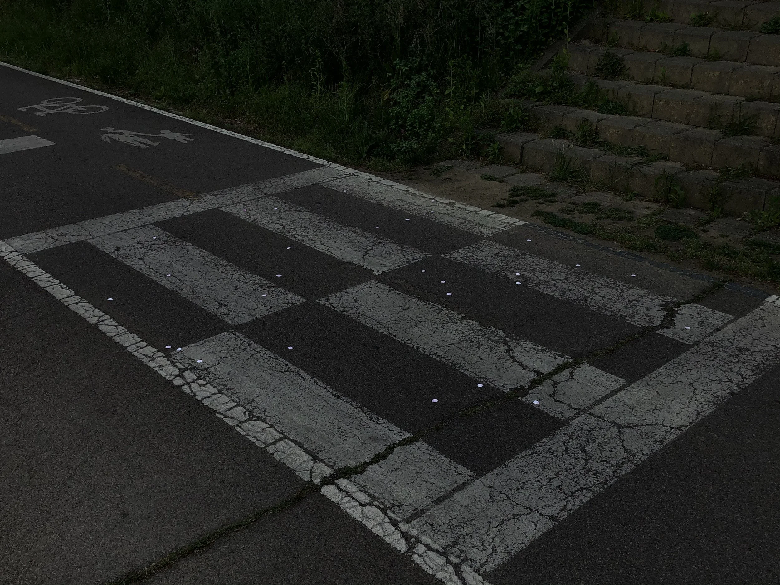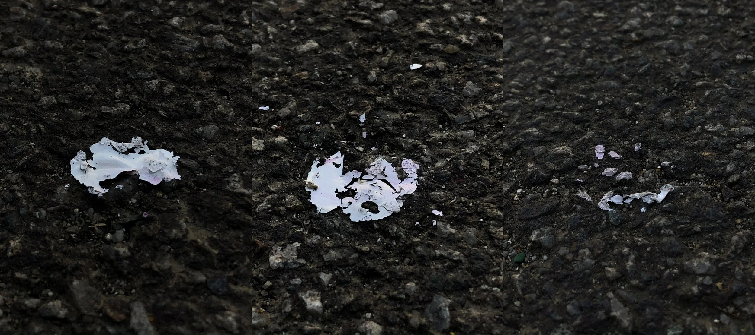 Tiny pieces of aluminum that replicate cherry blossoms are scattered across intersections and walkways around the neighborhood. They are observed for four days, but are later lost, leaving behind sporadic, faint marks.